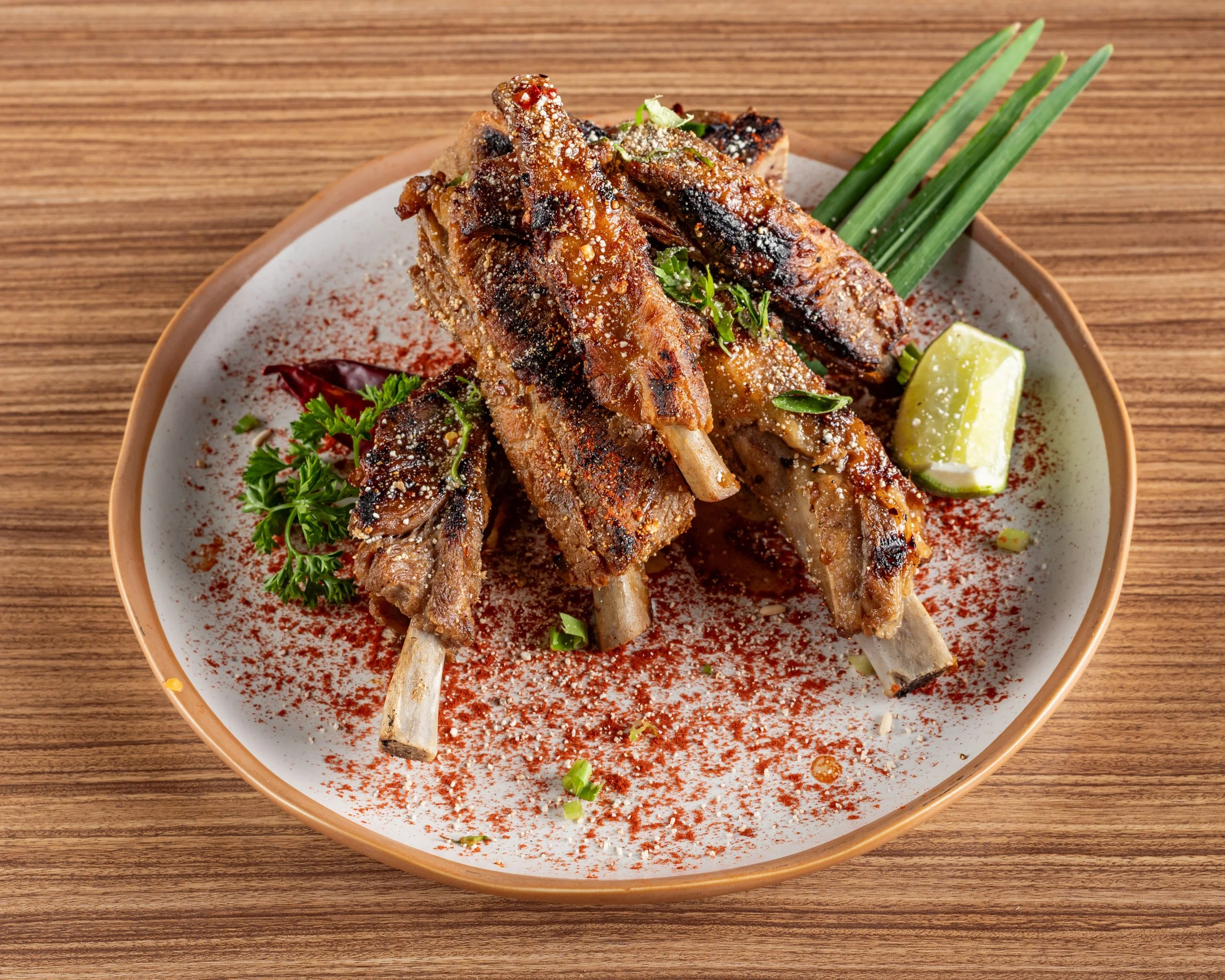 Marinated Baby pork rips with Thai seasoning powder sauce.