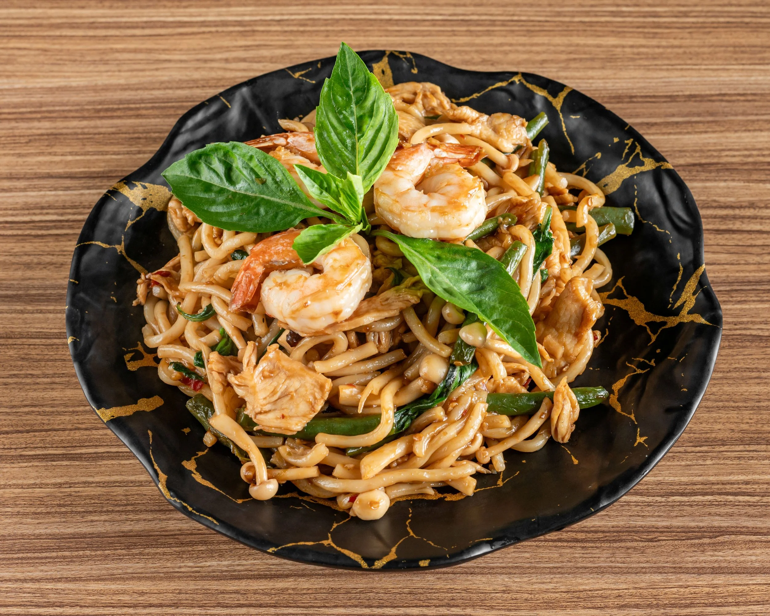 Udon noodle stir fry with garlic, mushrooms, green beans and basil.